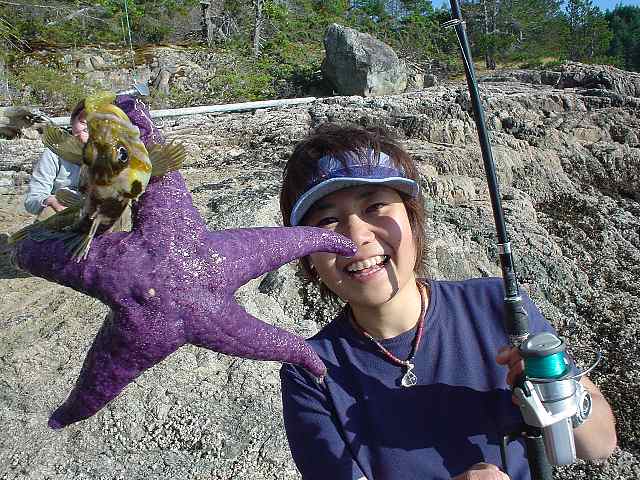 キエの竿が大きくしなり「げえ!大物だ!!」と喜んだが、上げてみたら小さなロックフィッシュと大きなスターフィッシュ(ヒトデ)だった。